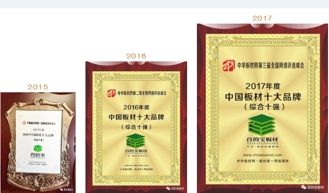 2015、2016、2017百的寶板材連續三年成功蟬聯了“中國板材品牌”榮譽,