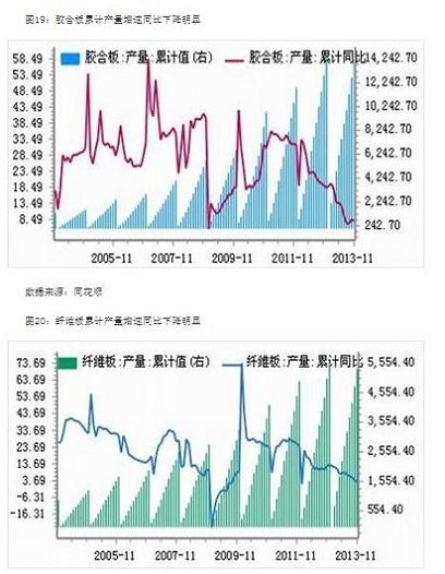 2013年11月,我國人造板產(chǎn)量為2605.8萬立方米,同比增加1.8%;累計產(chǎn)量24349萬立方米,同比增加5.1%;同比增速均在放緩。具體到膠合板,11月份產(chǎn)量為1489.78萬立方米,同比增長5.4%,累計產(chǎn)量14152.3萬立方米,同比增長8%;纖維板方面,11月份產(chǎn)量為600.97萬立方米,同比增長-1.82%,累計產(chǎn)量5358.77萬立方米,同比增長3.12%。產(chǎn)量的下降意味著市場需求的減弱,人造板需求高速增長的時代已經(jīng)過去。