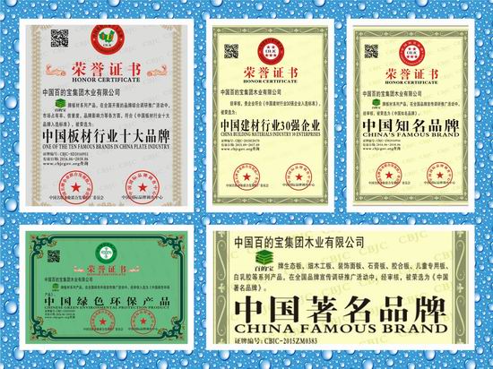 百的寶板材先后通過ISO9001質量體系認證、ISO14001環保體系認證、ISO18001職業健康安全體系認證。并多次榮獲“中國綠色環保產品”“中國建筑行業30強企業”“中國著名品牌”“中國板材行業品牌”等榮譽稱號,其產品質量的有優良性都是得到國家權威機構和消費者認可的。
