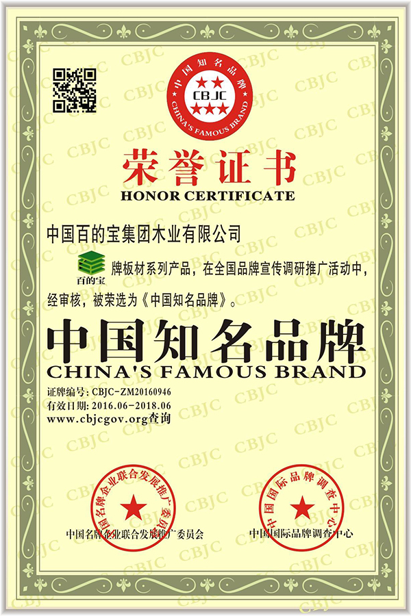 2016年06月中國百的寶集團(tuán)木業(yè)有限公司旗下“百的寶”牌板材系列產(chǎn)品被中國名牌企業(yè)聯(lián)合發(fā)展推廣委員會(huì)、中國國際品牌調(diào)查中心檢測,選為“中國知名品牌”。