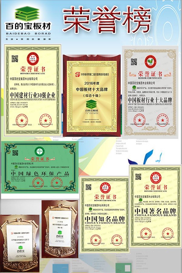 先后被評為“中國著名品牌”、“中國綠色環保產品”、“中國板材品牌”“中國建材行業30強企業”“中國知名品牌”“2016年度影響力品牌”等榮譽。