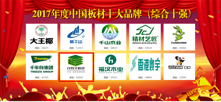繼2015年和2016年榮獲中國板材品牌(綜合十強)之后,百的寶板材梅開三度,今年再次將此殊榮收入囊中!